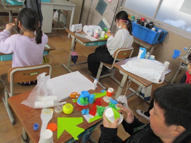 ゴムでとぶ仕掛けを使って、おもちゃ作りをしています。