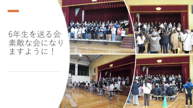6年生を送る会のリハーサルを行いました。1~5年生までは保護者の参観もありました。明日の本番に向け、緊張しながらも精一杯本番をイメージしてリハーサルに臨んだ子どもたちでした。