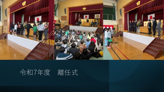 令和7年度の離任式を行いました。児童、保護者の皆さん、卒業生、地域の皆さんに見送っていただきました。