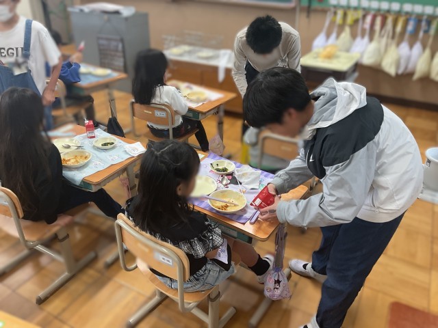 初めての給食に戸惑うことも多い1年生。6年生が優しく教える姿が印象的でした。