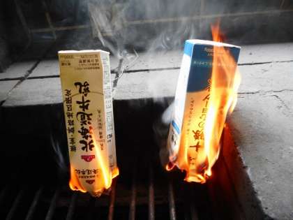 アルミで包めたら,牛乳パックに入れて火をつけます。