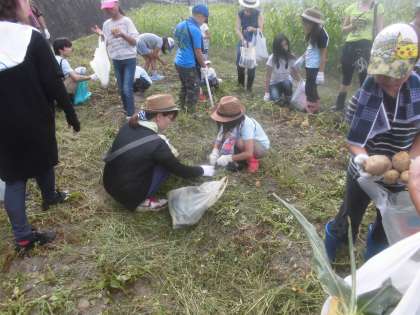 毎年のお楽しみ,「おおやぶ家庭教育講座」(野菜収穫体験)が本日行われました。40家族,およそ100名が参加があり,みんな笑顔で収穫していました。「今日はカレーやな。」「ジャガイモのピザ結構おいしいよ。」自分たちで収穫した野菜を使った料理で,今夜はきっとパーティーですね。トウモロコシの種を植え始めたのは,3月頃だそうです。今まで準備を進めていただいた,植松会長をはじめ,PTA役員の皆様,本当にありがとうございました。