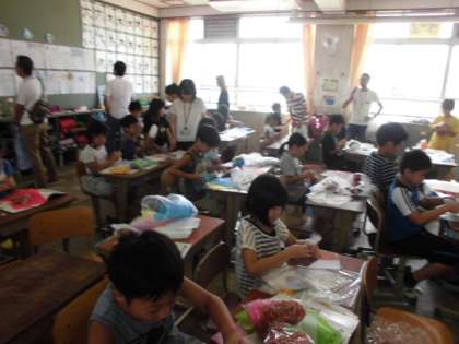 3年生,図工の様子です。自分の好きな色の紙を組み合わせて,作品を作っていました。