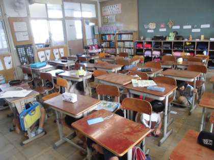 日曜参観では,震度5弱以上の地震が起きたという想定で,避難訓練,引き渡し訓練を行いました。