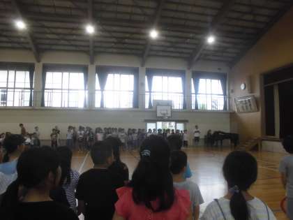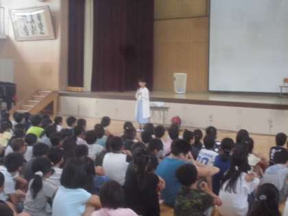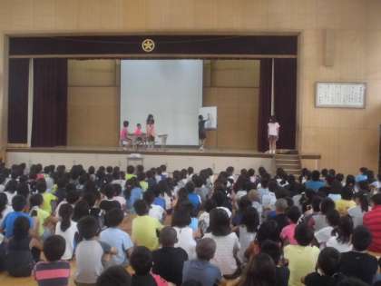今日は,朝から「児童集会」が行われました。計画委員の5・6年生が,舞台で劇をして,児童のみんなに,呼びかけてくれました。内容は,「久世スタンダード」に載っている「一生懸命勉強に取り組もう」・「久世の地域を大切にしよう」です。分かりやすく,楽しい劇でした。図書委員会からは,先日,久世中学校の図書委員会からプレゼントしていただいたしおりの紹介がありました。最後は,全校合唱。大藪小学校のみんなの素敵な歌声が体育館に響きわたりました。みんなで,元気良く,一週間のスタートです。