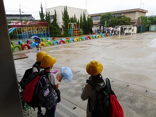雨の中子どもたちは大きな荷物をしょって学校にやってきました。