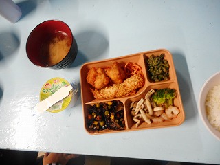 エビフライ,から揚げなどのおかずに味噌汁とゼリーも付いています。