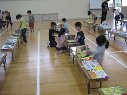 体育館で選書会がありました。お気に入りの本を見つけようと,