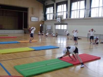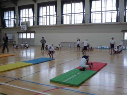 技が終わったらポーズを決めること,マットを直して安全確認をし,次の人に合図を出すことなど,活動の順序にも慣れてきました。