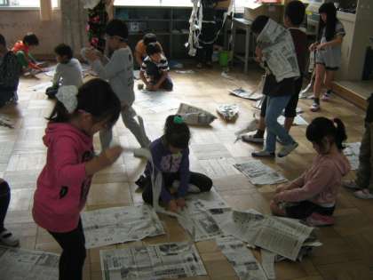 新聞紙をねじり合わせて長いロープのようにしたり,