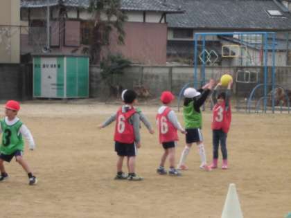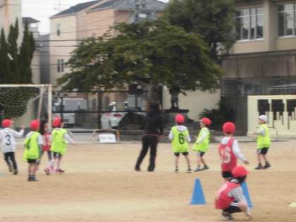 1年生は体育で「パスゲーム」を行っています。まだまだ判定でもめたり,ボールの周りばかりに集まったり・・・ということもありますが,ルールを覚え,自分たちで考えながら,チームプレーもだんだんできるようになってきました。