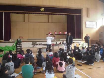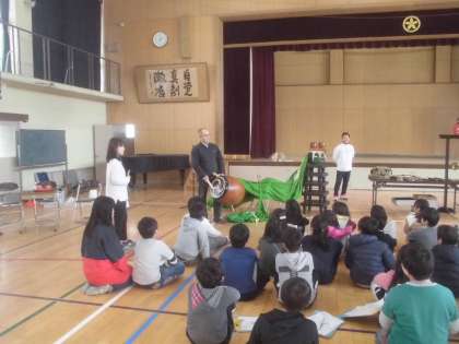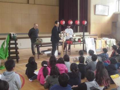 昼休みの発表会の後,5・6時間目は,3年生が「六斎念仏」の学習を行いました。お世話になったのは,部活動でもお世話になっている「久世六斎念仏保存会」の皆様です。歴史ある「六斎念仏」について丁寧に教えていただきました。寒い中,本当にありがとうございました。