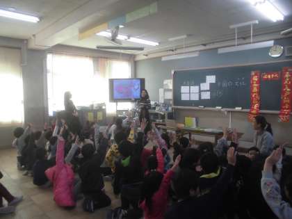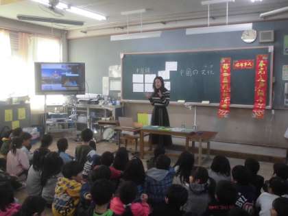 本日,京都市国際交流協会の皆様にお世話になり,多文化学習推進プログラムが行われました。1年生には,中国の李月さんに来ていただき,中国の言葉や自然,文化のことなど多くの事を教えていただきました。李月さんの出身地,ハルピンでは,気温がマイナス30度になることをあるようで,子どもたちは「えー!寒いー!」とビックリでした。みんな,ニコニコ楽しい1時間の学習でした。李月さん,「謝謝!」「ありがとうございました。」
