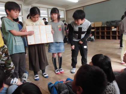 総合的な学習の時間で,3年生は京セリについて調べたり,実際に作って食べたりして京セリのよさを知りました。今日は,京セリの栄養やおいしさなどをまわりの人たちに知ってもらうために,リーフレットにまとめたことを2年生に発表しました。