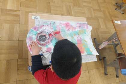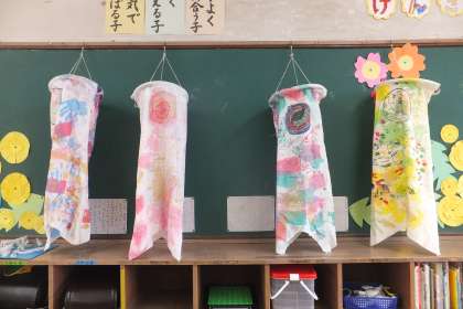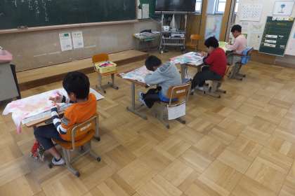 目の色をかえてみたり,身体の部分にうろこや模様を描きたしたりして,昨年とはまた違った感じで素敵になりました。今日は雨降りなので教室で乾かしましたが,リニューアルしたこいのぼりが5月になると運動場で元気に泳ぎます。