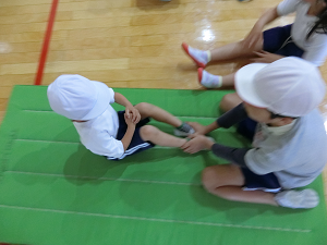 ひまわり学級と1年生,6年生で新体力テストを行いました。1年生は6年生とペアになって,5つの種目に挑戦しました。