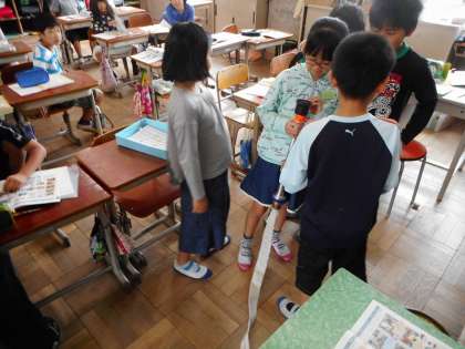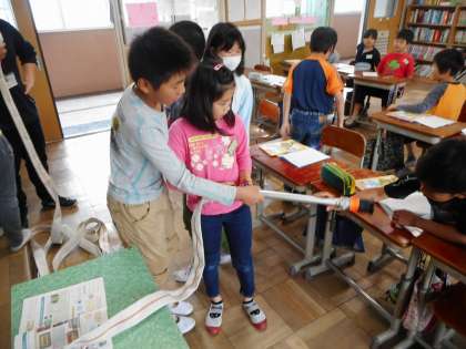 社会の学習で,実際の放水で使われるホースや筒を触り,消防士の仕事に興味をもちました。そして,消防士の一日について調べ,話し合いをしました。