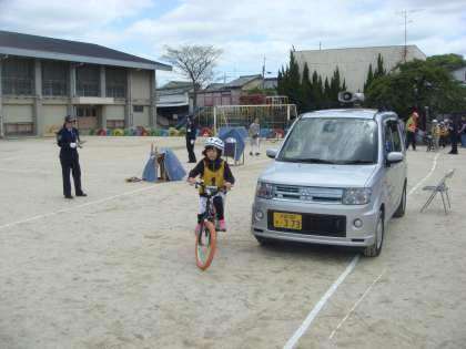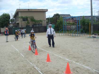 運動場では,二つの実技試験に挑みました。道路に見立てたコースで,ルールを守りながら自転車を運転する試験では,周囲をきちんと確認しながら慎重に進んでいました。もう一つの運転技能の試験でも,ポールを倒さないように慎重に運転していました。