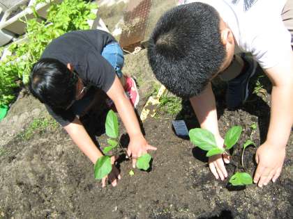 今日はひまわりの畑に夏野菜の苗を植えました。エダマメとナスとラッカセイです。