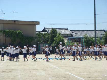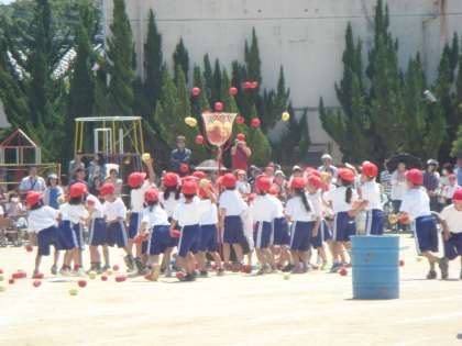 続いて,1年生の「やってみよう♪玉入れ」がありました。とてもかわいいダンスと,みんな一生懸命の玉入れを見せてくれました。