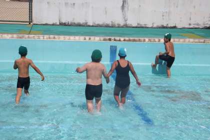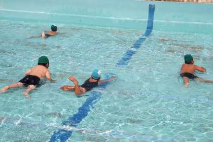 みんな素早く上手に着替え,気持ちも準備もばっちりです。プールでの約束事を確認し,広いプールで思い切り走ったりワニさん歩きをしたりして,今年初めてのプール学習を楽しみました。