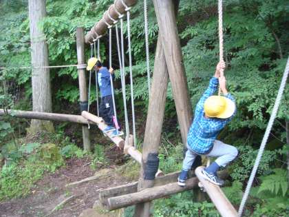 冒険の森アスレチックでは,つり橋を渡ったり,ひもやチェーンのはしごを登ったりと,思う存分アスレチックを楽しんでいました。中でも,ターザンロープは大人気。勢いをつけてスタートすると,どの子も満面の笑顔で,「キャー」「ウォー」と絶叫していました。これで四日目の活動は大きなけがなく,みんな元気に終了しました。これから久世西小との交流班で昼食を食べて,退所式をします。
