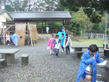 二日目の午前の活動は「所内ラリー」でした。雨はそれほどきつくなかったので,かっぱを着て出発しました。どの班もみんなで力を合わせて,番号のついたポストを見つけ,そこに書かれた問題を解いていました。みんなで考えを出し合って答えがわかった時には,とびきりの笑顔でした。全員が交代してリーダーとなり,地図を持って進む道を示すのですが,ここでも不安そうにしていると,周りから優しく教える姿がありました。今日のめあてを着実に達成していっています。