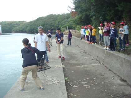二日目のお昼には雨もやみ,少し涼しい中で,かご漁体験のかごを仕掛ける活動をしました。かごを入れる深谷水道の歴史の話を聞いた後,いよいよかごを海に投げ入れます。班ごとに「たこーー!」「ハオコゼーー!」「フグーー!」と入っていてほしい魚の名前を呼びました。明日,かごを上げるときにたくさんの魚が入っていることを祈ります。