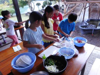 二日目の午後の活動は「野外炊事」でした。初めての調理,かまどでの火起こしに挑戦しました。ここでも調理グループの友達との協力が見られました。自分の仕事が終わったら,友だちの仕事を手伝ったりと,とても素敵な姿がたくさん見られました。