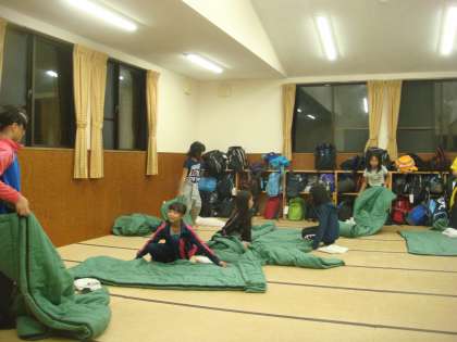 いよいよ二日目も終わろうとしています。子どもたちはバンガロー,60畳に分かれて寝る用意をしています。