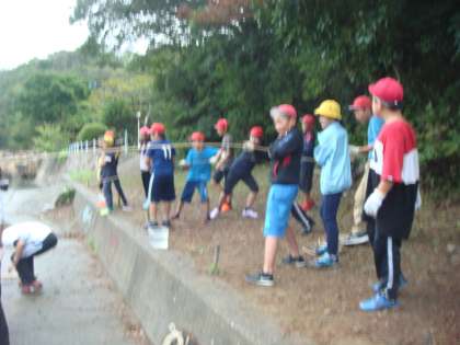 かごを揚げている様子や生き物を観察している様子です。