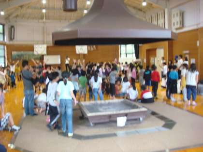 4年生は全員けがなく,しんどい人も出ず,元気いっぱいです。しかし,天気は小雨が降ったり止んだり。地面がぬれているので,プレイホールで行いました。急きょ,久世西小学校と合同で行い,交流グループで「輪送り」や「大型じゃんけん」をしました。