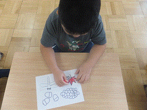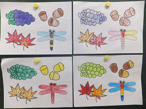 今月はみなみなかよしフェスタがあります。今日は「あきみつけにいこう」という競技の準備として,秋に見られるもののカードに色塗りをしました。