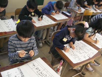 書き初めで「元気な子」と書きました。めあては「ゆっくりていねいに お手本をよく見て書こう」です。字の大きさや,バランス,とめやハネ。書写ではたくさん注意することがあります。みんな集中してがんばって書いていました。