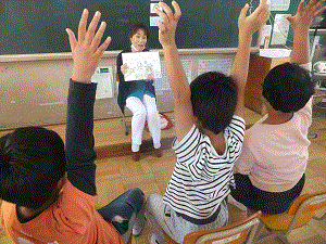 いつも歯や口腔内を診ていただいている学校医の横田先生にきていただき,絵本の読み聞かせや歯の指導をしていただきました。子どもたちはいつも読んでくださる本が大好き。その後のクイズもとても楽しみにしています。今回もお話を聞いた後,張り切ってクイズに答えていました。虫歯に関するお話をいつも聞いているので,食後は言われなくても歯をみがく子どもたちです。