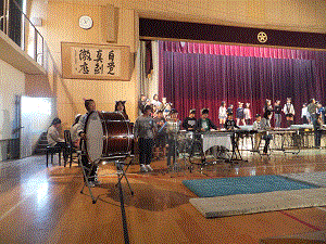 ひまわり学級は,6年生有志の子たちと一緒に,秋祭りを表現します。 5年生児童は交流で楽器を担当し,みんなと一緒に演奏します。4年生児童は,ナレーターで大きな声で言うことをめあてにしています。