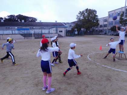 4年生の体育はポートボールをしています。凍えるような寒さの中,元気に体育の学習に取り組んでいます。