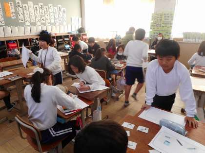 単元の最後の活動として,これまで活動したことを使い,自分のお気に入りの文房具セットをつくりました。「Do you have a pen?」客と店に分かれて,英語で文防具を持っているかを訪ねていきます。あいさつをしたり,身振りを取り入れたりと,それぞれが工夫して楽しく活動できていました。