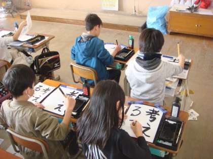 書写では,一年間の学習のまとめとして,今まで学習したことを使って,「考える子」を毛筆で書きました。一画一画,書く前にどう書けばよいかを考えてから,丁寧に書き上げていました。