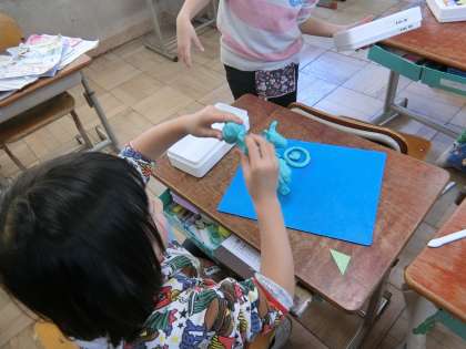 散歩に行くならどんな仲間がいいか考え,思い浮かべながら今日は油粘土で作品をつくりました。