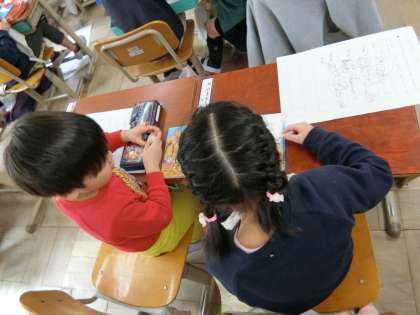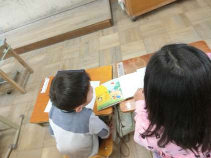 今日は,隣の人と一緒に本を読み,どんなお話なのかをワークシートに書きました。