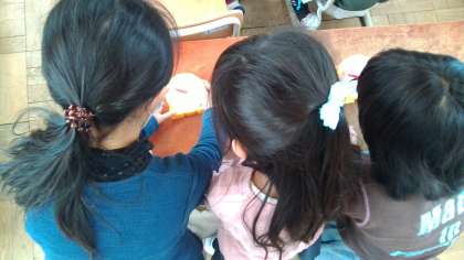 算数科で時刻と時間について学習しています。どうしたら,時間を求めることができるか,時計の模型を使って動かしてやってみました。「5,10,15…」長い針がどれだけ動いたかが時間を求めるポイントです。お互いに「これをこう動かして…」と相談して答えを出そうとしていました。