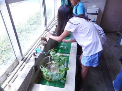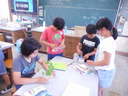自分たちで発芽させたインゲン豆を使い,実験の方法も自分たちで考えます。