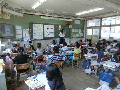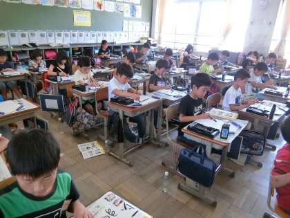 書写の時間には,筆の使い方について話を聞き,何度も書いて練習をしました。