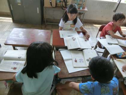 国語科の「こまを楽しむ」では,「言葉で遊ぼう」の学習を生かして説明文の読み取り方を確認しました。