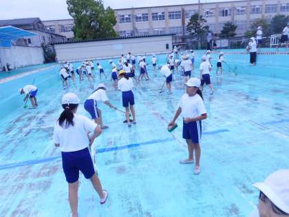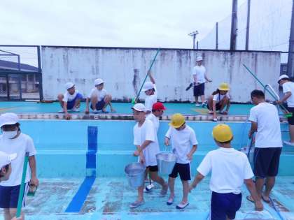 1年間使っていなかったプールは汚れていましたが,6年生が頑張ってくれたおかげで,ぴかぴかになりました。
