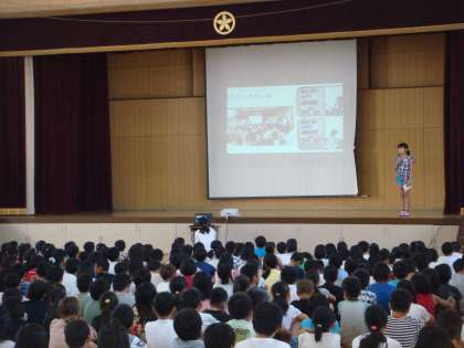 今回は,児童会から今までの活動の紹介がありました。7月のはじめに行われた久世中の生徒会,久世西小学校の児童会と一緒に行った「久世サミット」と,夏休み中の「みやこキッズ会議」についての報告がありました。どちらも大薮小を代表して意見を出すだけではなく,様々な学校の取組を聞いて,児童会として今後目指してくべき方向を考えていることがわかりました。児童会だけではなく,全校で自分たちの課題について考えていって欲しいです。