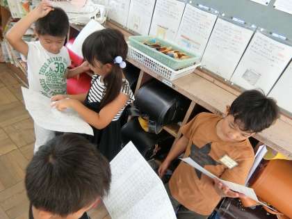 友達におすすめしたい物や場所や人を決め,メモをもとに「はじめ」「中」「おわり」の組み立てを考えて文章を書きました。書けた人から交流スペースで文を読み合い,友達にアドバイスをしたり,良いところを伝えたりしている姿が見られました。