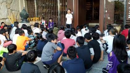 朝食を食べ,部屋をきれいに片づけた後,旅館の退所式をしました。リーダーの司会・言葉のもと,お世話になった旅館の方にしっかりお礼を伝えることができました。さあ,元気に,うどん打ち体験に出発です。