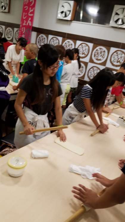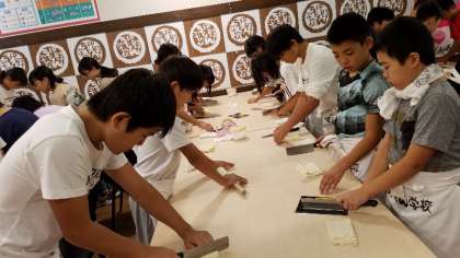 6年生は,中野うどん学校へ到着し,うどん打ち体験をしました。自分たちの昼ごはんのうどんを打つ。みんな,最高のおいしいうどんになるように,説明を聞き,集中して粉を練っていました。コシを出すために,足で踏んでいきますが,お店の方の面白い声かけもあり,子ども達はノリノリで,うどんをふみふみ・・・。きっとおいしいうどんになっていると確信しています。